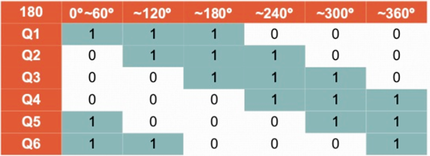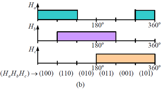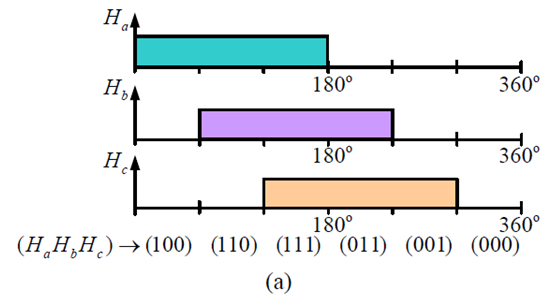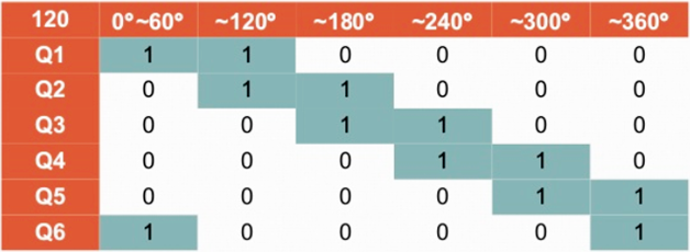 根據霍爾元件的訊號可將轉子角度由360°(機械角)分為六個不同的區間。每一個區間為60° 。