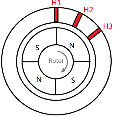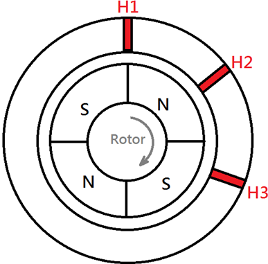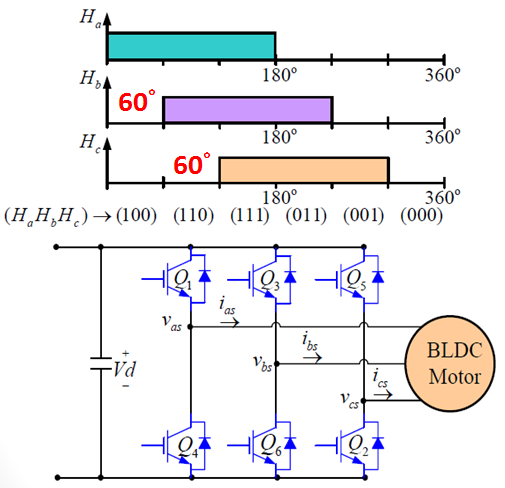 霍爾元件可以呈120或60度(Electrical cycle)排列,即Hall與Hall訊號間隔,因此各需要相應的驅動波形