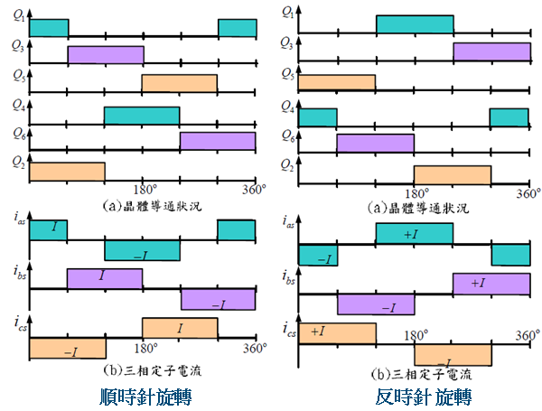 - 每個定子線圈導通角度為180°後,改變電流方向